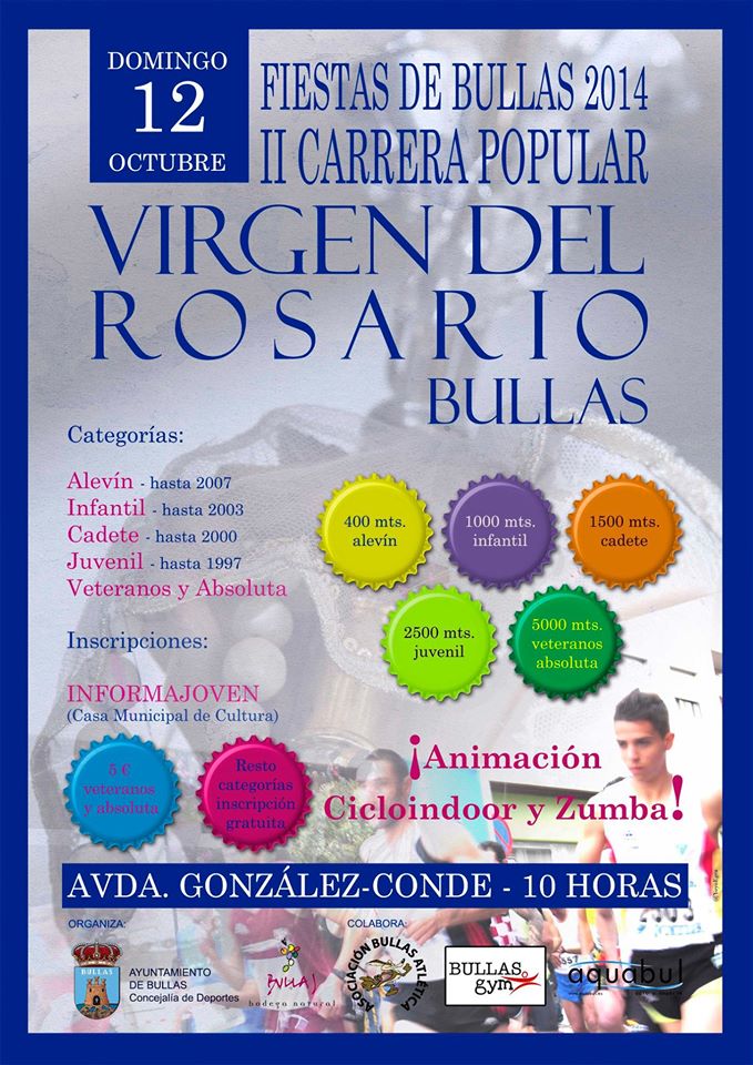 Mañana se disputa la II carrera popular Virgen del Rosario de Bullas a las 10:00 horas desde la avenida González Conde de la localidad. Diversas categorías son las que hay preparadas desde alevín, infantil, cadete y juvenil con distancias más cortas, hasta las categorías absoluta y veteranos que lo harán con la distancia de 5 km.