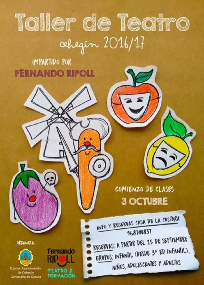 Los interesados en participar en una nueva edición del Taller de Teatro, que imparte el actor y director ceheginero Fernando Ripoll, pueden realizar ya su inscripción en la Casa de la Cultura. Está organizado por la Concejalía de Cultura, que dirige Maravillas Fernández, y tiene su fecha de inicio el próximo 3 de octubre. Los precios por persona son de 10 euros al mes con una clase a la semana, y 15 euros al mes por dos clases a la semana.