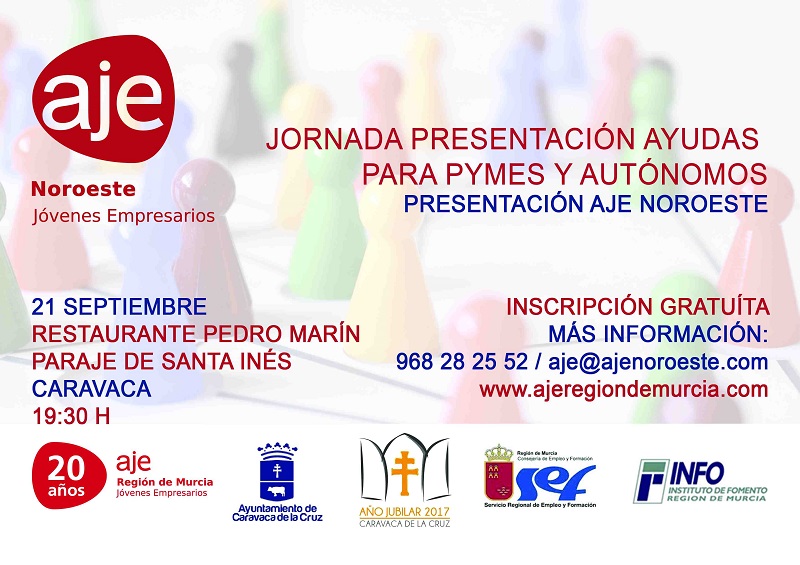 La Asociación de Jóvenes Empresarios de la Región de Murcia (AJE) y el Ayuntamiento de Caravaca de la Cruz celebran el próximo miércoles, 21 de septiembre, una jornada dirigida a PYMES y autónomos, en la que se darán a conocer acciones de fomento, promoción y difusión de la cultura emprendedora, enmarcadas en el convenio de colaboración suscrito entre ambas organizaciones.