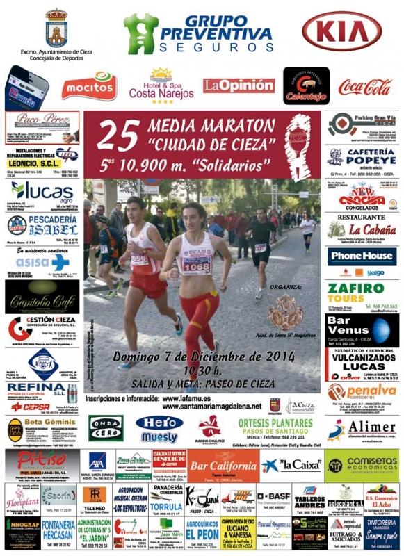 Será este domingo 7 de diciembre la XXV Media Maratón Ciudad de Cieza, a partir de las 10:30 horas, desde la esquina del convento. Ésta prueba demás es la penúltima prueba del circuito de la liga Challenger 2014.