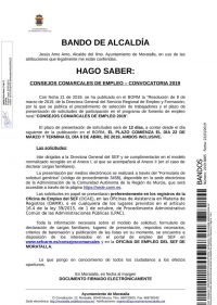 El Ayuntamiento de Moratalla emite un bando informando de la publicación en el BORM del procedimiento de selección de trabajadores/as y el plazo de presentación de solicitudes de participación en el programa de fomento de empleo rural: Consejos Comarcales de Empleo 2019.