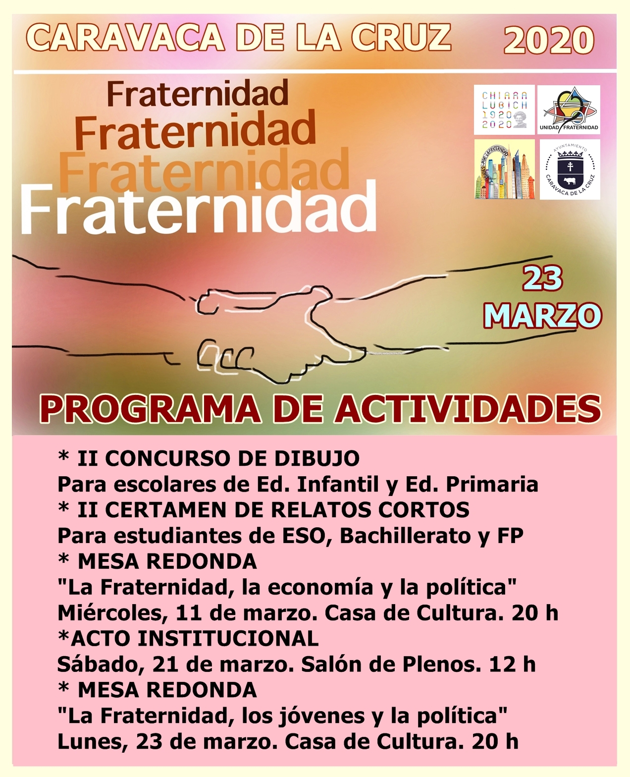 Para ello, se ha consensuado un programa de actos con los tres grupos políticos con representación en la Corporación Municipal, que incluye la convocatoria de un concurso de dibujo, dirigido a escolares de educación Infantil y Primaria; un certamen de relatos cortos para estudiantes de enseñanzas medias; dos mesas redondas para abordar la fraternidad desde diferentes ámbitos de la sociedad, y el acto institucional, que tendrá lugar en el Salón de Plenos el sábado, 21 de marzo.