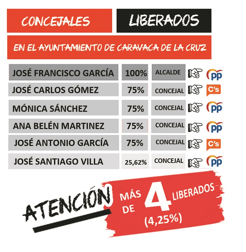- José Francisco García, alcalde de Caravaca de la Cruz , cuenta con una liberación del 100%, que asciende a un total de 000 Euros