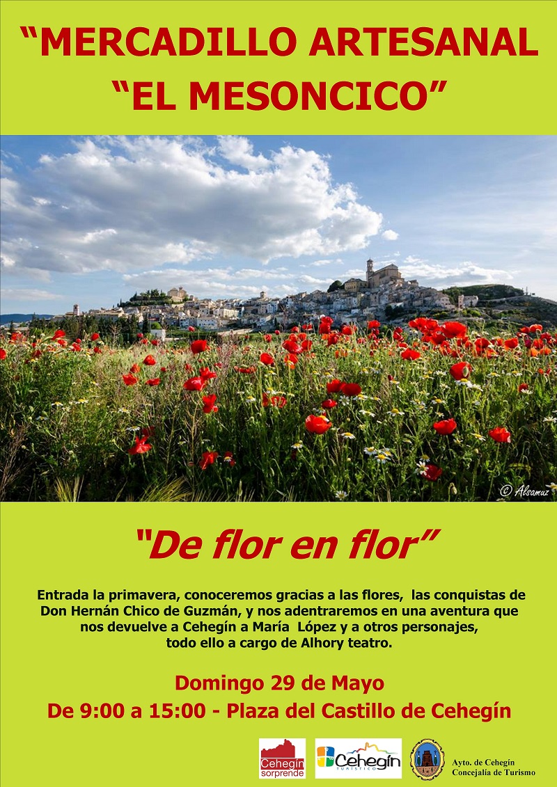 El próximo domingo, día 29 de mayo, a partir de las 9:00 horas, tendrá lugar el tradicional Mercadillo El Mesoncico, tal y como ha informado la Concejala de Comercio y Turismo, Ana María Molina López. En esta ocasión, y coincidiendo con la primavera, éste llevará el título temático siguiente: “De Flor en Flor”.