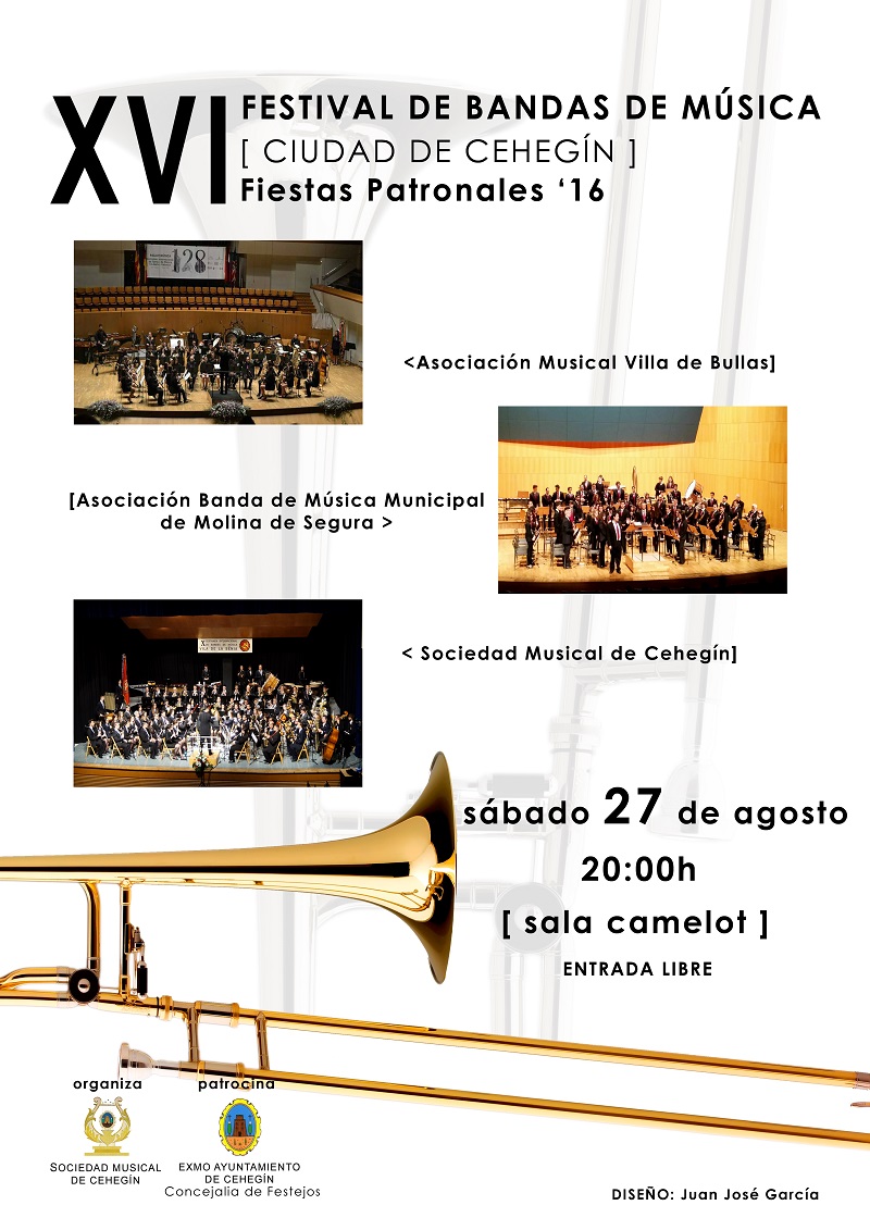 La Asociación Banda de Música Municipal de Molina de Segura y la Asociación Musical Villa de Bullas, junto a la anfitriona, la Sociedad Musical de Cehegín, participarán en el XVI Festival de Bandas de Música ‘Ciudad de Cehegín’, que se celebrará el próximo sábado, 27 de agosto, a partir de las 20:00 horas en la Sala Camelot. La entrada es libre.