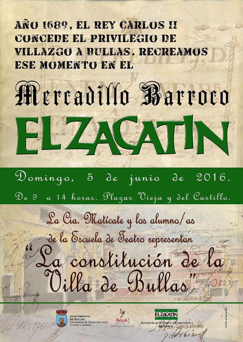 Los artesanos vuelven a vestirse de época y las calles y plazas se llenan de sabor barroco. La Plaza de España, adyacente al espacio donde se desarrolla el mercadillo y su principal puerta de entrada, se convierte en el escenario de la representación de una obra teatral ‘La constitución de la Villa de Bullas’ donde se recrea precisamente el proceso que llevó a la independencia de Bullas, a cargo de la compañía de teatro Maticate y los alumnos de la Escuela de Teatro de la localidad.