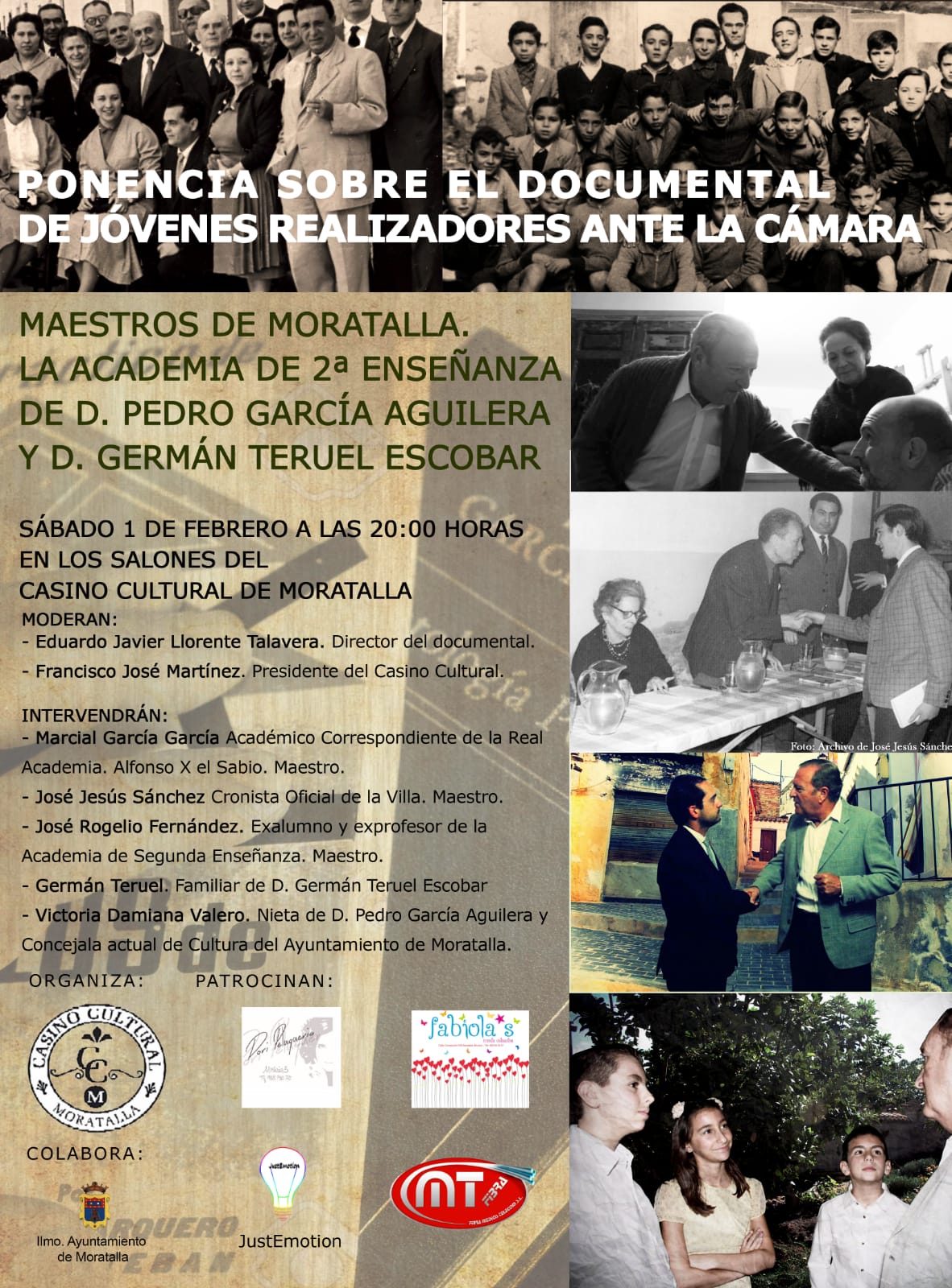 El acto contará con la participación de varios de los entrevistados en el documental, familiares de los dos profesores y será moderado por el director y guionista del documental, Eduardo J. Llorente Talavera, y Francisco José Martínez Vélez, Presidente del Casino. Estará organizado por el Director del Documental y la Directiva del Casino encabezada por el Presidente Francisco José Martínez y José Rodríguez.