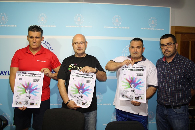 Ha sido presentada en el Ayuntamiento la 1ª Master Class Spinning por las enfermedades raras, que tendrá lugar el sábado, 18 de junio, a las 18:00 horas, en la explanada antigua de la estación del tren. Así lo han hecho público el Concejal de Deportes del Ayuntamiento de Cehegín, Joaquín López Carreño; Pascual Donate, responsable comarcal de la Asociación por las Enfermedades Raras D,Genes, ambos colaboradores de esta solidaria prueba; y también los organizadores de la misma, el Club Mountain Bike Los Simao y los directores del gimnasio ceheginero Power Fitness Center, tanto Pencho como Vicente.