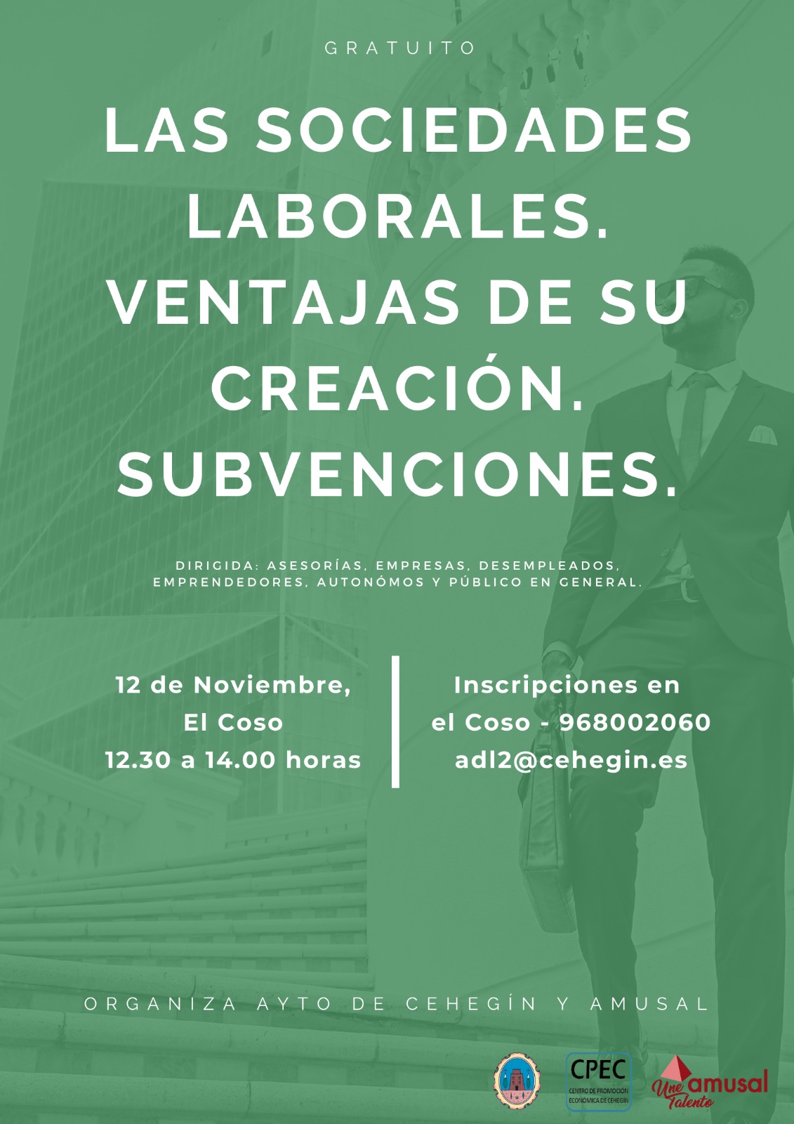 El Ayuntamiento de Cehegín, a través de la concejalía de Empleo, que dirige Juan Guillén, y AMUSAL, llevarán a cabo una jornada sobre ‘Las sociedades laborales. Ventajas de su creación. Subvenciones’. Será el 12 de noviembre (de 12:30 a 14:00 horas), en las instalaciones del Coso.