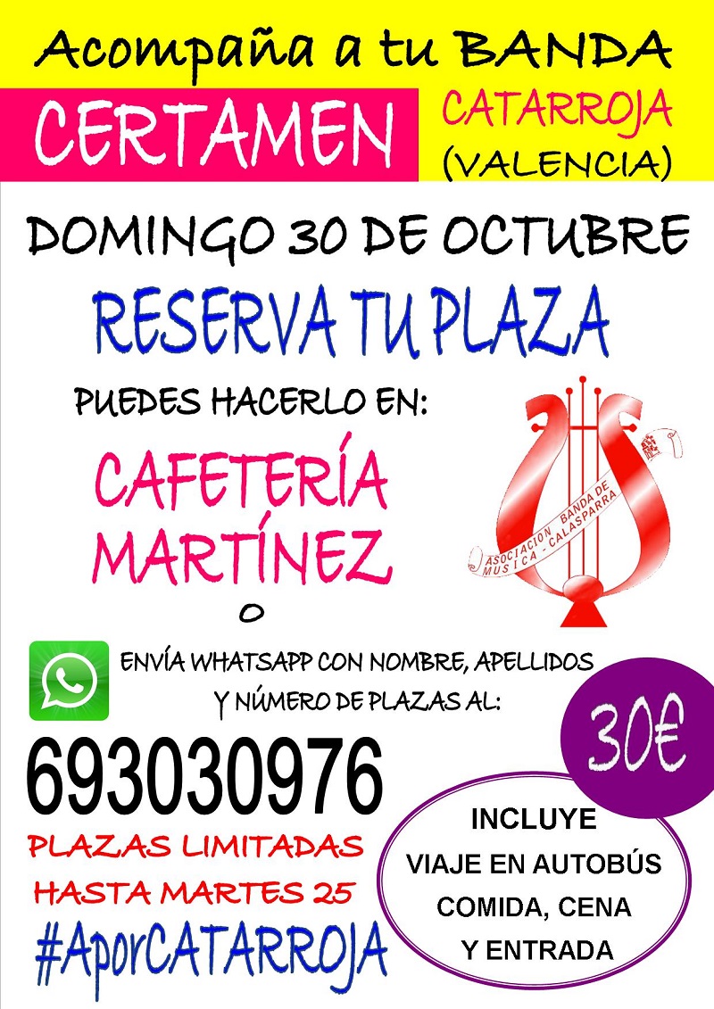 Necesitamos que reservéis vuestra plaza en CAFETERÍA MARTÍNEZ o enviando un WHATSAPP al teléfono 693030976 indicando vuestro nombre, apellidos y el número de plazas antes del martes 25 de octubre.