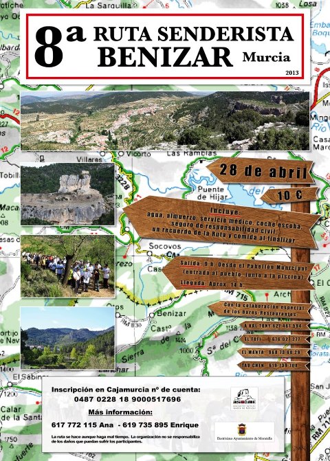 El pasado domingo se celebró en Benizar la VIII ruta de senderismo 2013, colaborando con este evento el Ayto. de Moratalla. A la prueba acudían unas 300 personas llegadas de distintos puntos de la Región de Murcia. La mañana fría hacía presagiar malos pronósticos a la hora de realizar la ruta, pero a pesar de ello no obstaculizó la realización de ésta. A las 9:00 horas daba inicio la ruta con 15 km por delante, el monte empapado, una niebla intensa y una previsión de lluvia del 85%, los participantes a la prueba no querían dejar de pasar la oportunidad de realizarla, ya que de lo contrario tenían que esperar a otro año para ver los parajes que depara el itinerario diseñado. (más…)