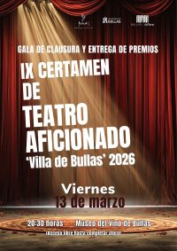 El próximo viernes 13 de marzo se celebrará en Bullas, en el Museo del Vino de Bullas, la gala de clausura y entrega de premios del IX Certamen de Teatro Aficionado ‘Villa de Bullas’, que este año ha superado todos los récords de participación. El acto dará comienzo a las 20:30 horas y el acceso será libre hasta completar aforo.