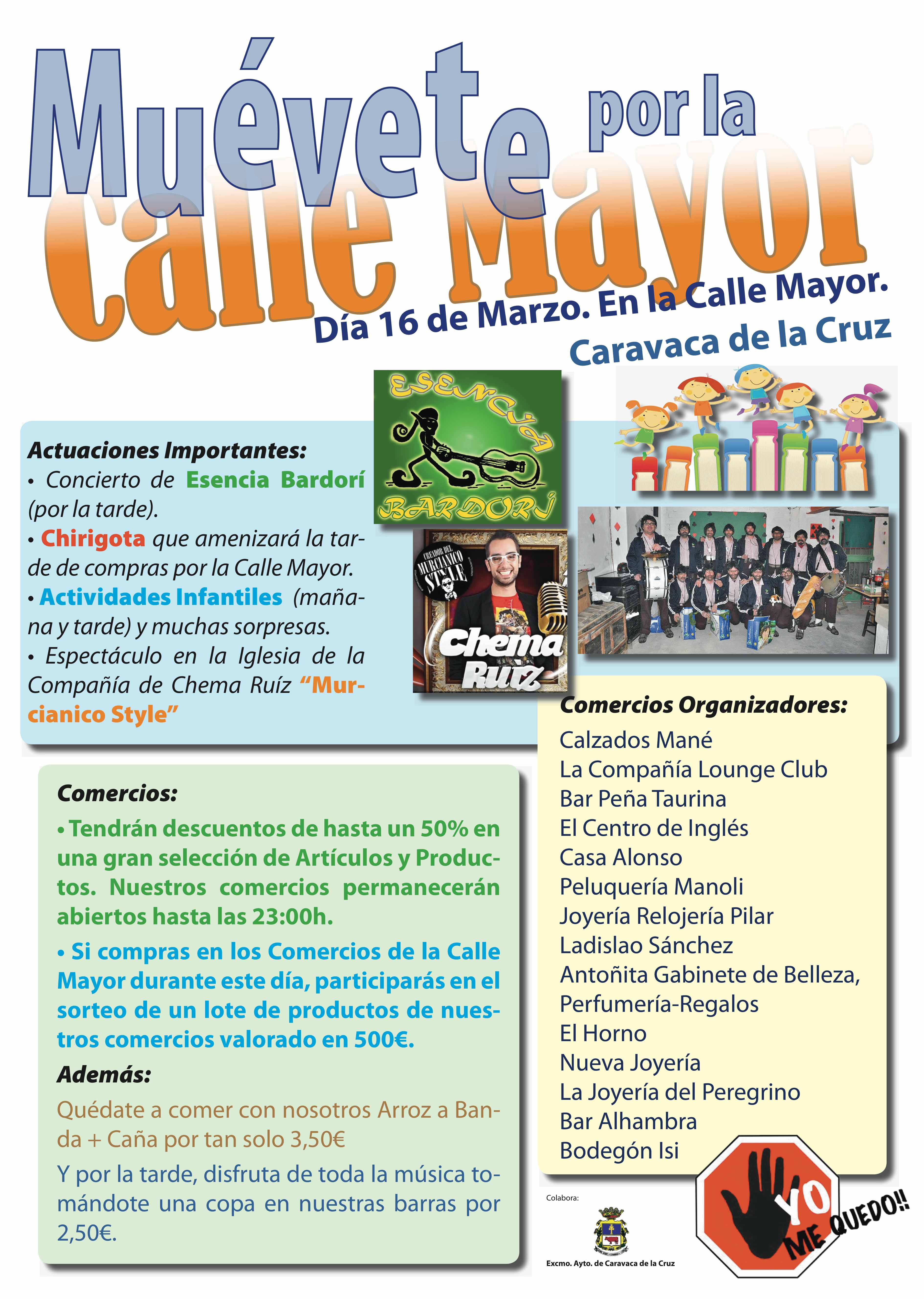 El sábado 16 de marzo el colectivo “Yo me quedo”, en colaboración con la Concejalía de Comercio del Ayuntamiento de Caravaca de la Cruz, celebra la actividad “Muévete por la calle Mayor” con el objetivo de dinamizar los locales comerciales y hosteleros ubicados en esta zona de del casco histórico de la localidad. Durante todo el día los establecimientos de la calle Mayor de Caravaca, que permanecerán abiertos hasta las 23.00 horas, tendrán descuentos de hasta el 50% en sus artículos. Además, habrá actuaciones del grupo local “Esencia Bardorí” y la chirigota de Caravaca, juegos y actividades de animación infantil y un monólogo a cargo del humorista murciano Chema Ruiz. También se ofrecerá comida y copas a precios populares. “Todas las personas que realicen sus compras en los establecimientos adheridos al proyecto “Muévete por la calle Mayor” entrarán a formar parte de un sorteo de un lote de productos valorado en 500 euros”, tal y como ha avanzado el representante del colectivo “Yo me quedo”, Antonio Calvache.
