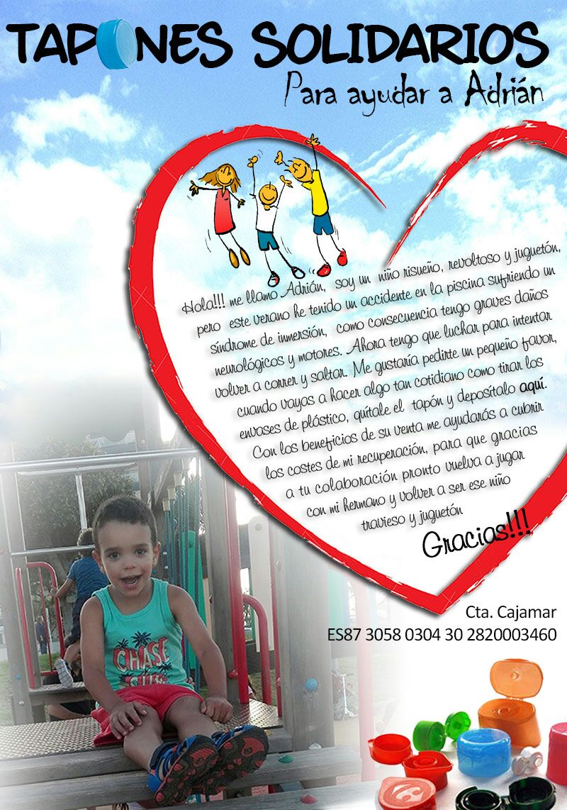 Adrián, murciano de 4 años, sufrió el pasado 1 de Agosto un síndrome de inmersión ocasionándole daños cerebrales y nerulógicos.  El importe obtenido al reciclar todos los tapones de plástico y latas recogidas se destinará a la familia para costear el tratamiento del pequeño Adrián y que pueda volver a correr, reir y jugar con su hermano y padres.
