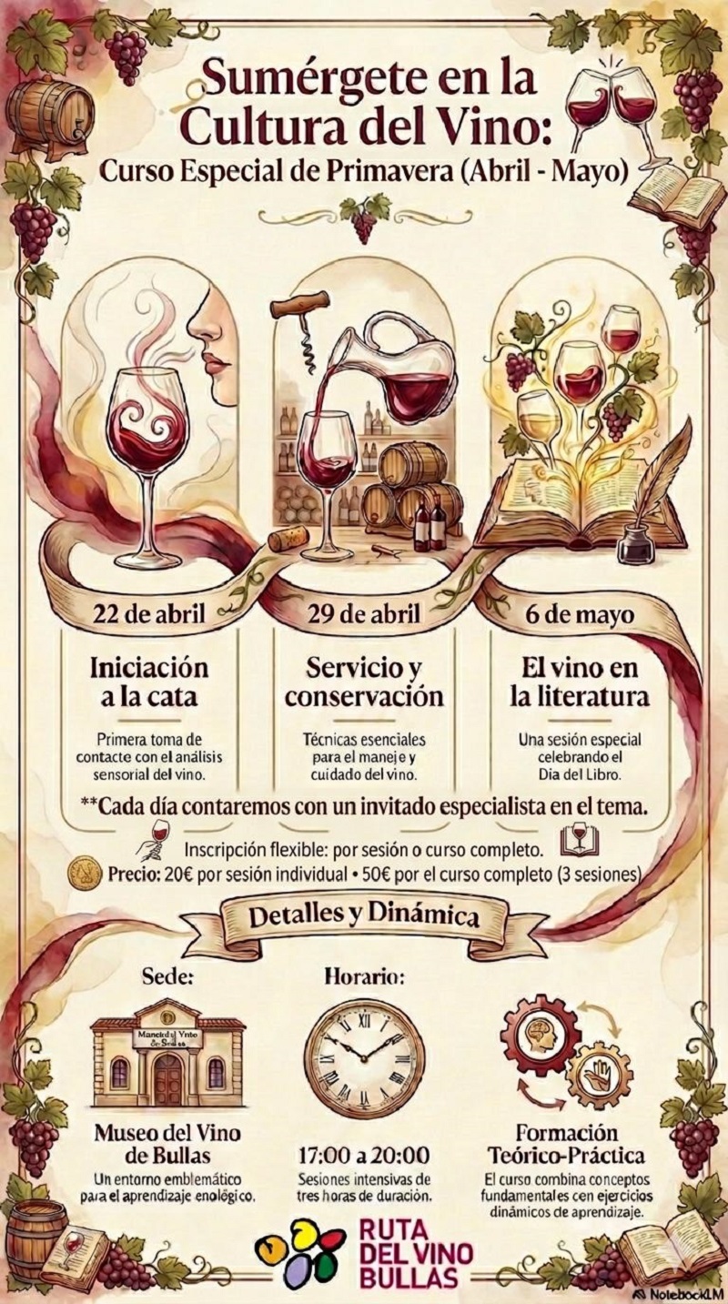 La Asociación Ruta del Vino de Bullas y el Ayuntamiento de Bullas, han puesto en marcha una nueva edición de talleres de cata bajo el título “El Mundo del Vino”, una propuesta formativa pensada para acercar la cultura vitivinícola a todos los públicos.