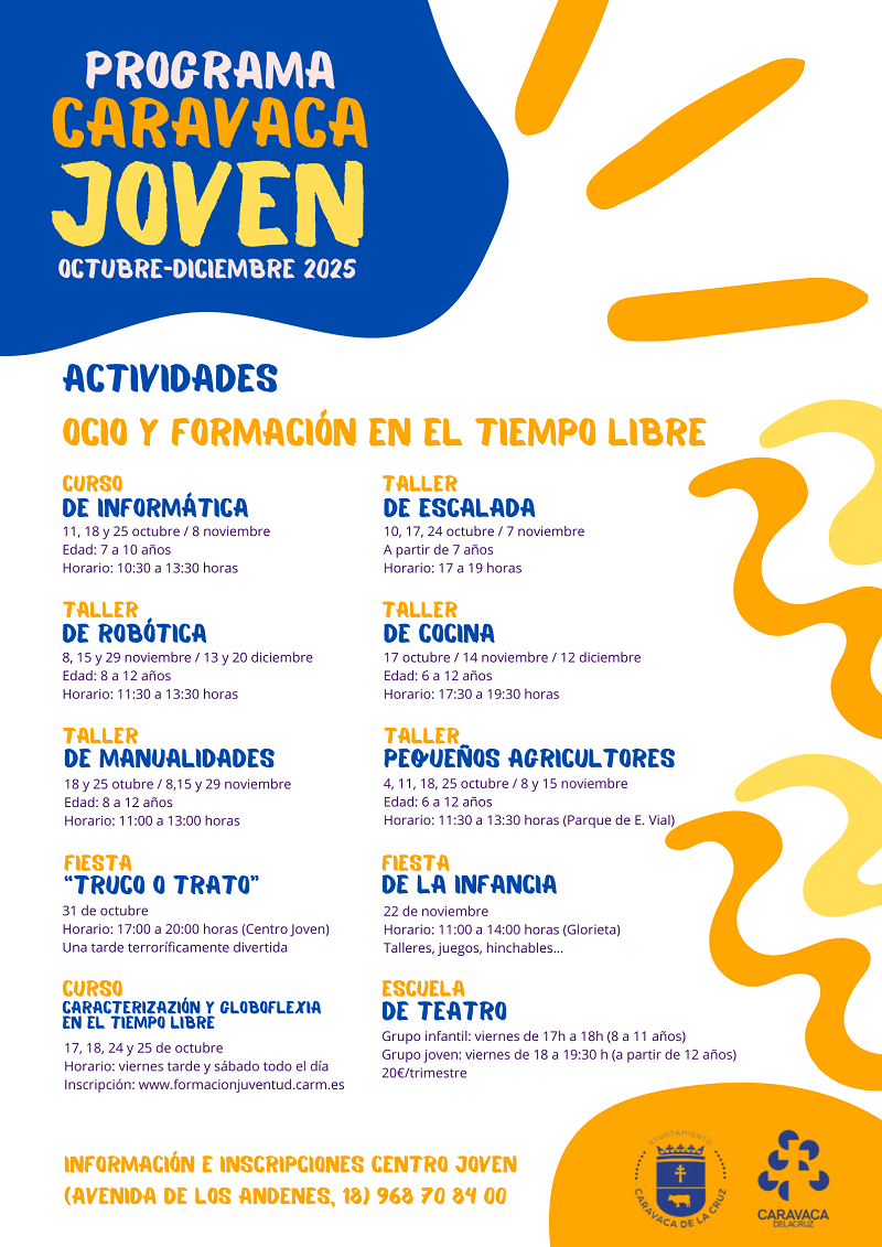 El Ayuntamiento de Caravaca de la Cruz ha lanzado la nueva programación ‘Caravaca Joven’, que se desarrollará entre los meses de octubre y diciembre, con una oferta de actividades orientadas a niños y jóvenes del municipio. La Concejalía de Juventud ha preparado talleres, cursos formativos, fiestas temáticas y un Plan de Apoyo Emocional, todo ello diseñado para fomentar el desarrollo personal, la creatividad y la participación activa y el ocio saludable.
