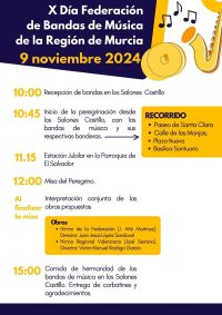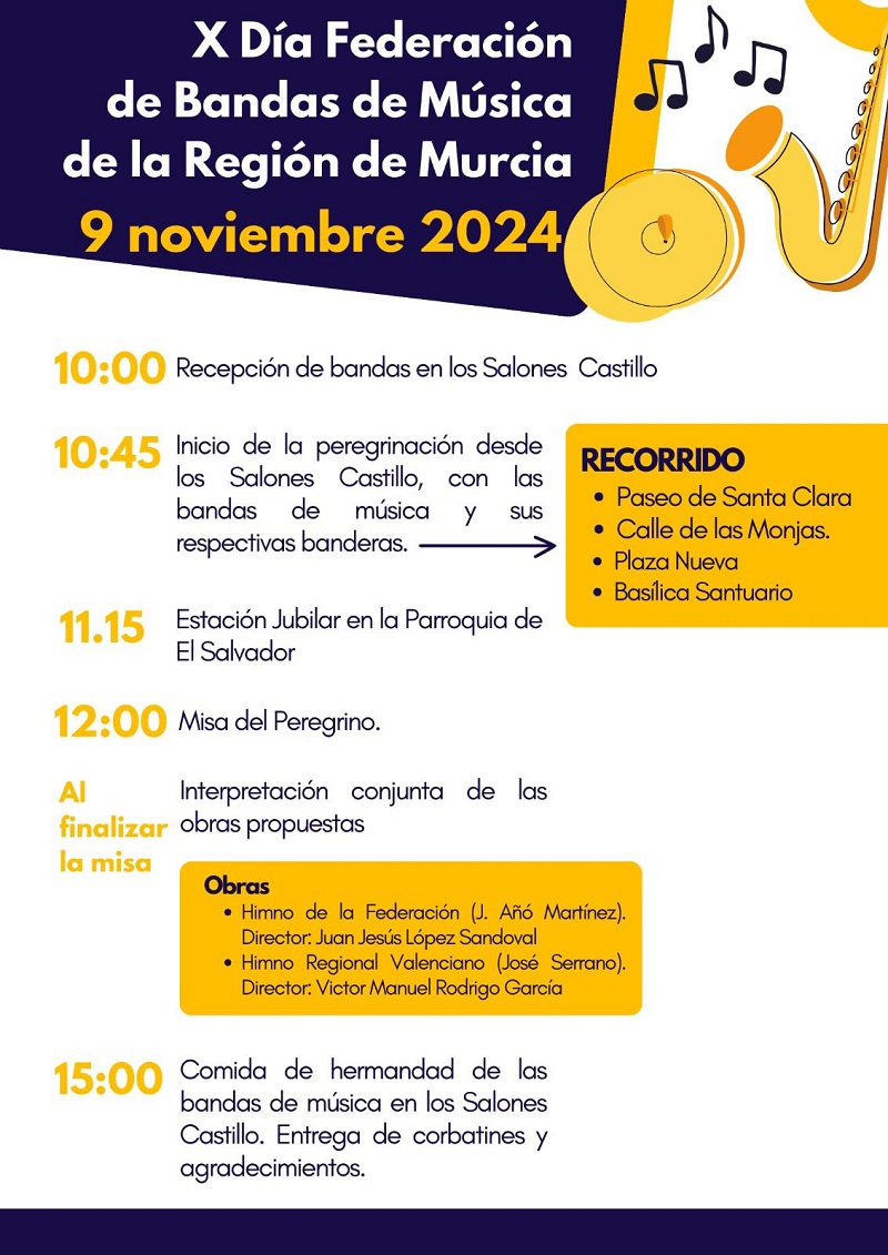 Adjuntamos programa definitivo del X Día de la Federación de Bandas de la Región de Murcia, organizado en Caravaca de la Cruz con motivo del Año Jubilar 2024, el próximo sábado, 9 de noviembre.