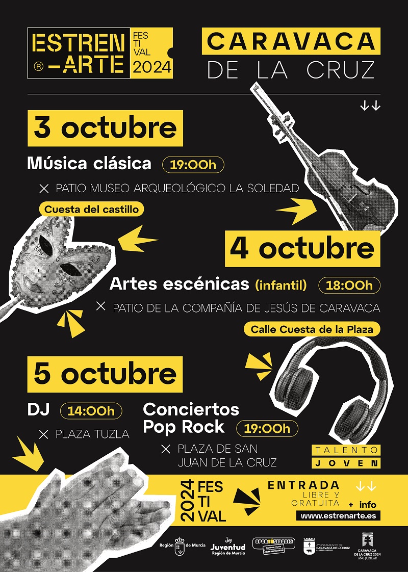 Distintos espacios urbanos y monumentales de Caravaca de la Cruz serán el escenario del jueves 3 al sábado 5 de octubre de muestras de música clásica, artes escénicas y conciertos pop-rock dentro de la programación del Festival de Talento Joven de la Región de Murcia ‘Estrenarte’. Las exhibiciones, abiertas al público y de acceso gratuito, correrán a cargo de jóvenes creadores, cuyos proyectos han resultado seleccionados en la edición de 2024 de este festival promovido y financiado la Dirección General de Juventud de la Región de Murcia.